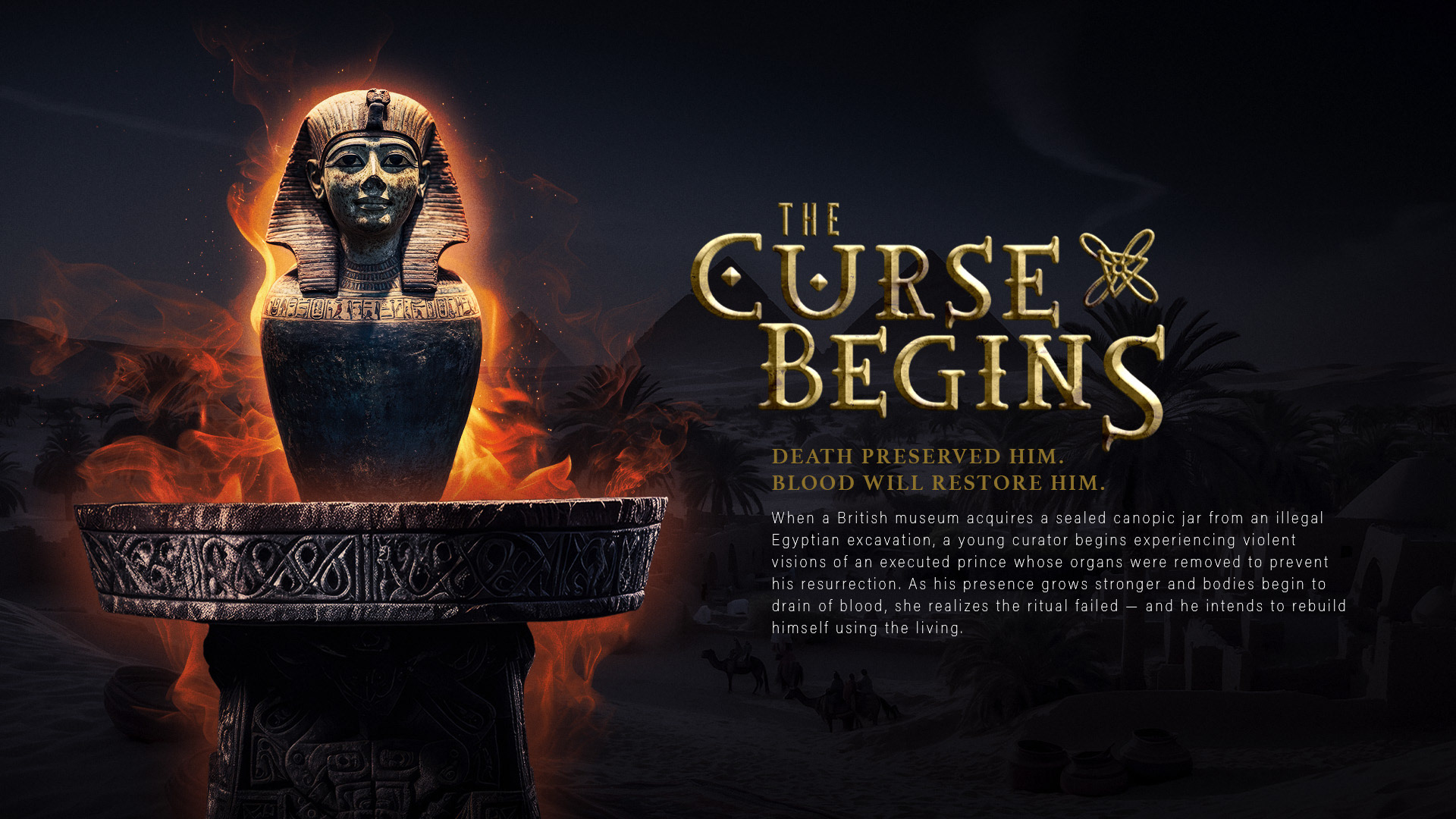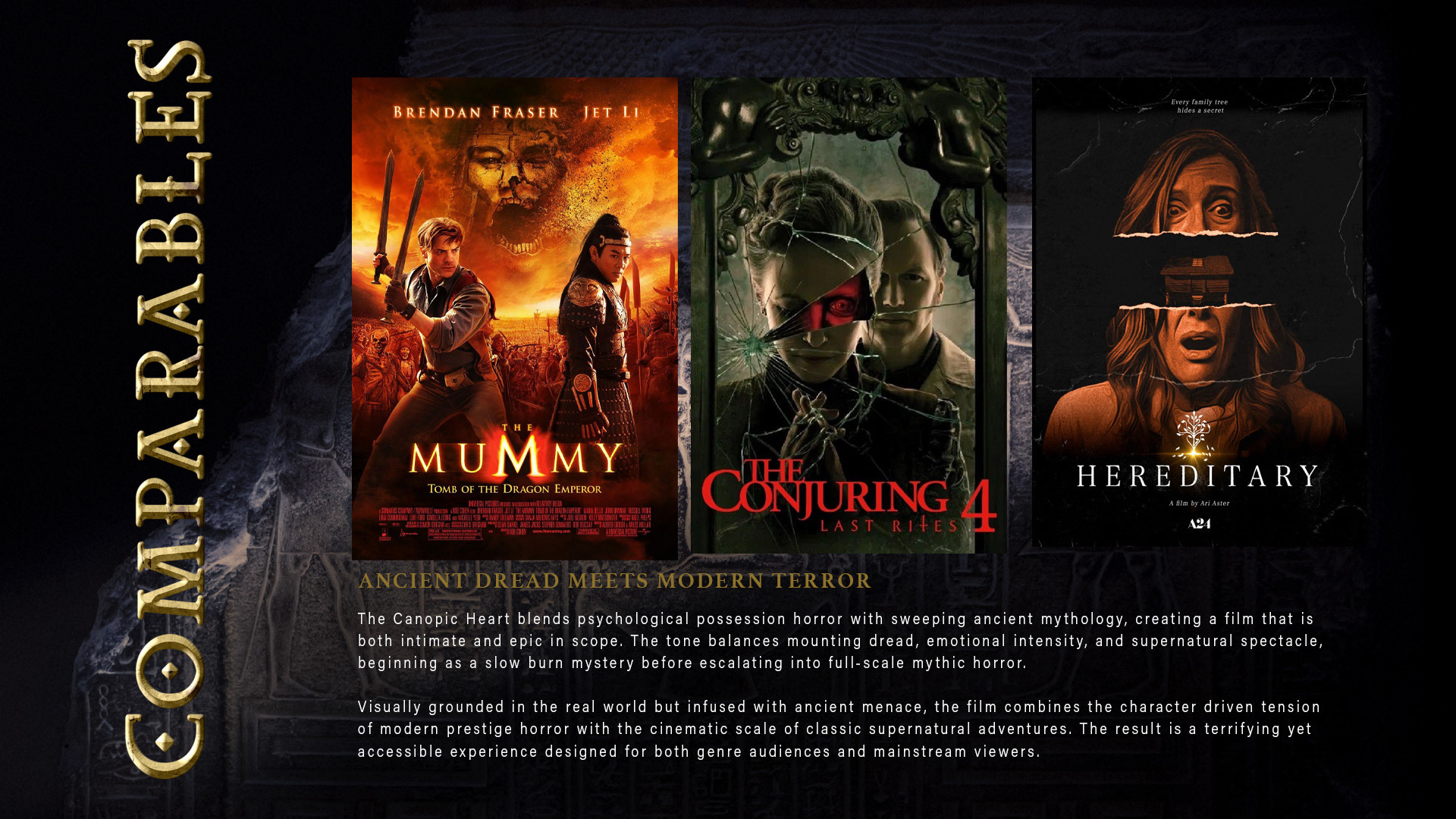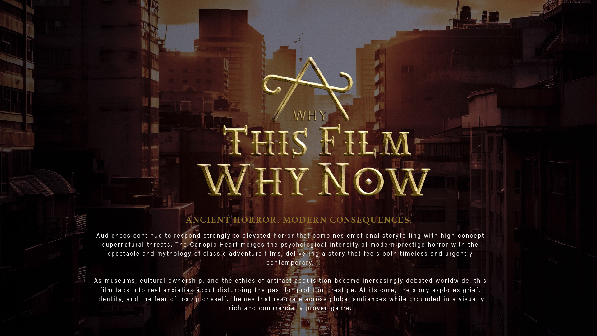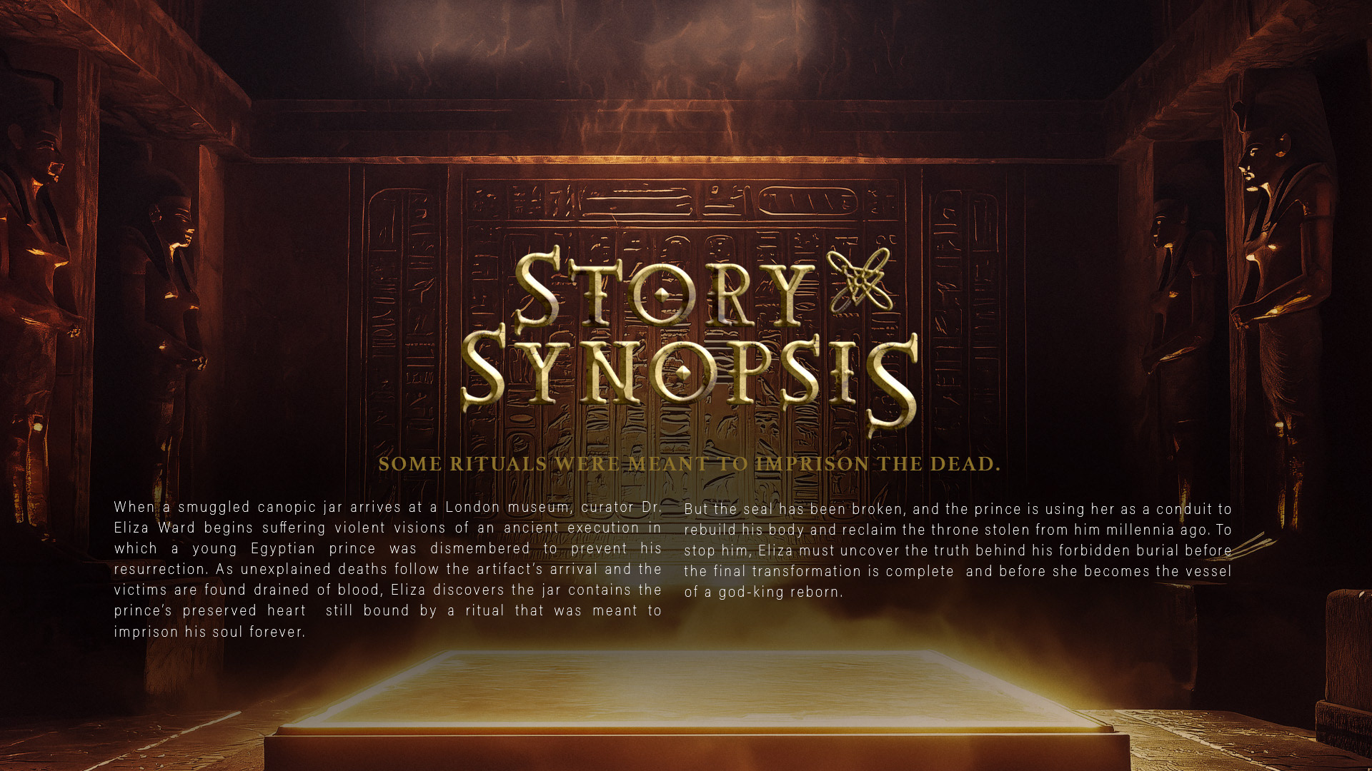 Project: THE CANOPIC HEART — Feature Film Pitch Deck This project is a concept pitch deck for a supernatural horror feature inspired by ancient Egyptian funerary mythology and modern museum archaeology. The presentation introduces a story centered on a sealed canopic jar containing the preserved heart of an executed prince, whose resurrection threatens the modern world. The visual approach blends historical authenticity with cinematic horror aesthetics, using warm gold tones, deep shadows, and textured environments to evoke both ancient grandeur and creeping dread. Layouts were designed to guide readers through character, mythology, tone, and market positioning while maintaining a cohesive visual language throughout.